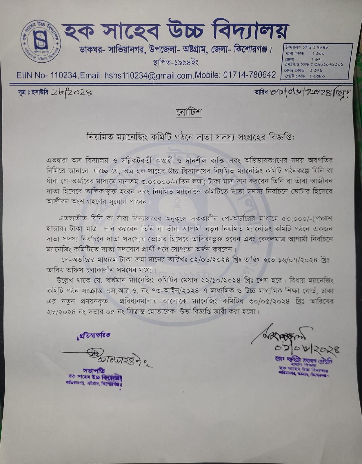 হক সাহেব উচ্চ বিদ্যালয়ে ম্যানেজিং কমিটিতে শূন্যপদে দাতা সদস্য সংগ্রহ চলছে।